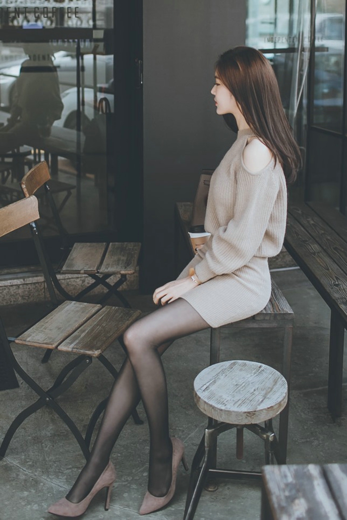 咖啡館外的露肩毛衣裙美模黑絲襪勾人